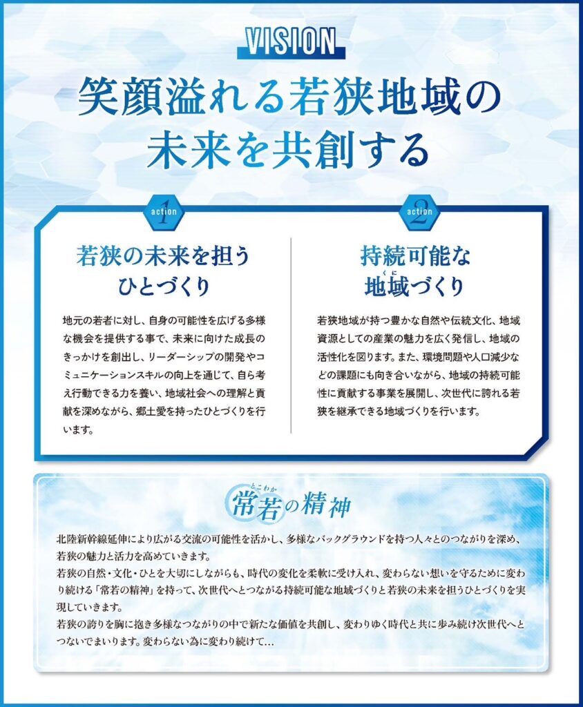 我々若狭青年会議所メンバー一同変わらない為に変わり続ける、常若の精神を基盤として、ひとづくりこそくにづくりの理念に基づき、笑顔溢れる若狭地域の未来を共創してまいります。