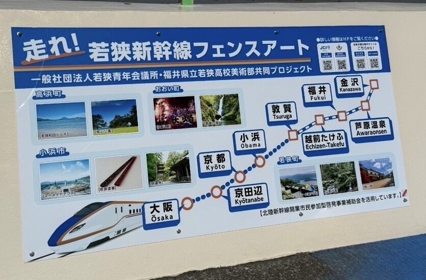 また、フェンスアート場所には、観光客や地域の方に認知提供と地域回遊を促進するため、地域の観光名所の写真や観光案内や団体や小浜市のホームページQRコードを取り入れた記念看板を設置しました。