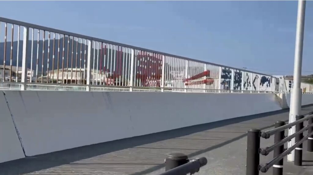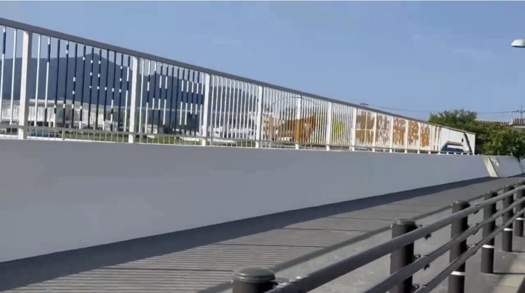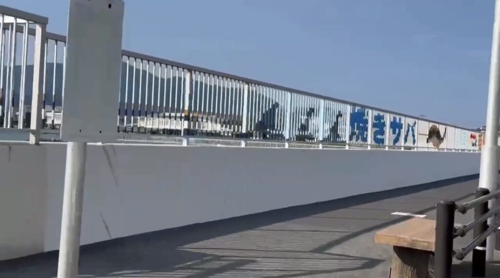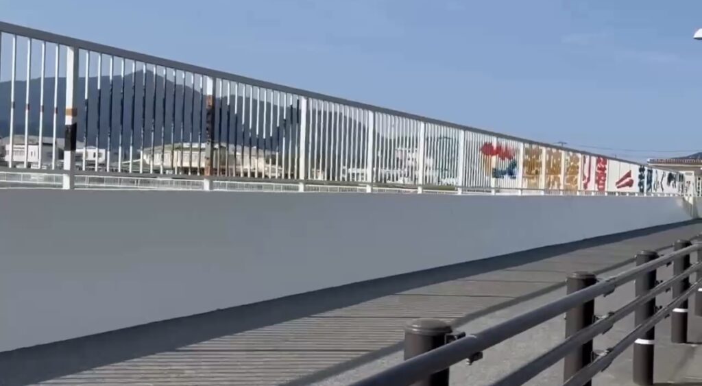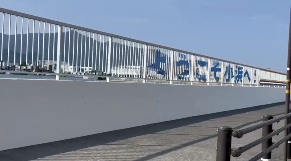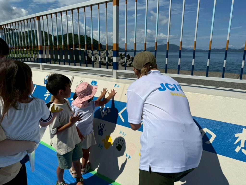 小浜市塩釜から日吉までの海岸通りのフェンス160mには「ようこそ小浜へ!」「焼きサバ」「若狭塗り箸」「若狭ふぐ」「宇宙鯖缶」「北陸新幹線」という文字とイラスト、手形アートが完成しました。