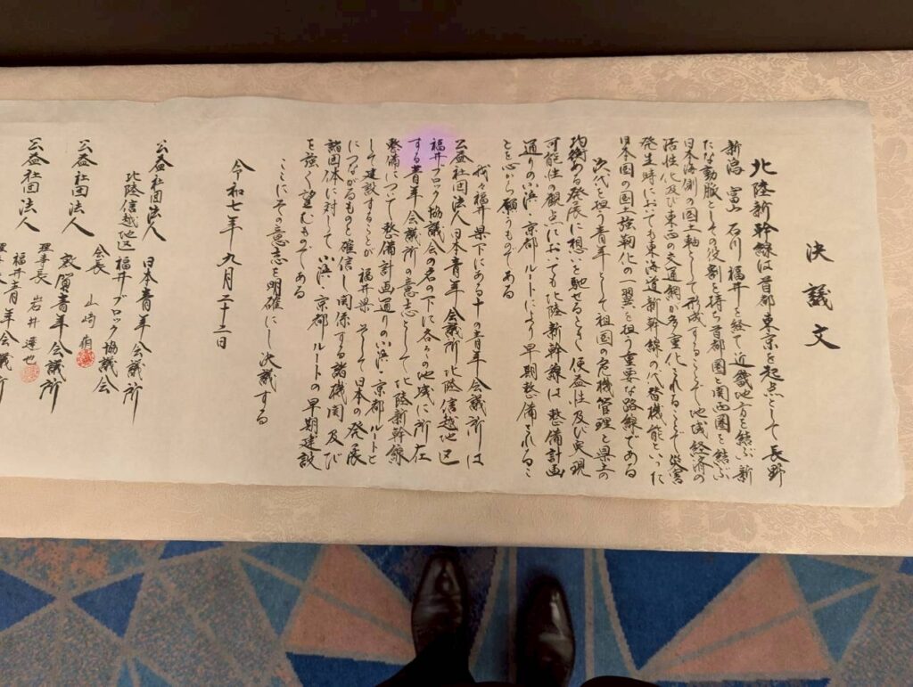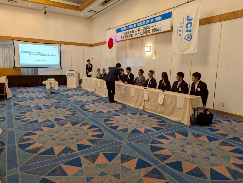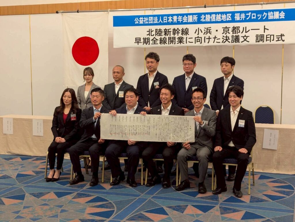 我々福井県下にある十の青年会議所は 公益社団法人 日本青年会議所 北陸信越地区福井ブロック協議会の名の下に各々の地域に所在する青年会議所の意志として 北陸新幹線整備について整備計画通りの小浜・京都ルートとして建設することが 福井県そして日本の発展につながるものと確信し 関係する諸機関及び諸団体に対して 小浜・京都ルートの早期建設を強く望むものである。 ここにその意志を明確にし決議する。」